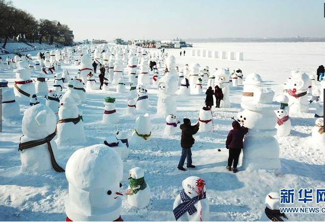 1月2日,市民、游客在雪人群中游玩观赏(无人机拍摄)。 2019个各式各样的雪人,近日在冰城哈尔滨市的松花江畔亮相,引来众多市民游客游玩观赏。 新华社记者 王建威 摄