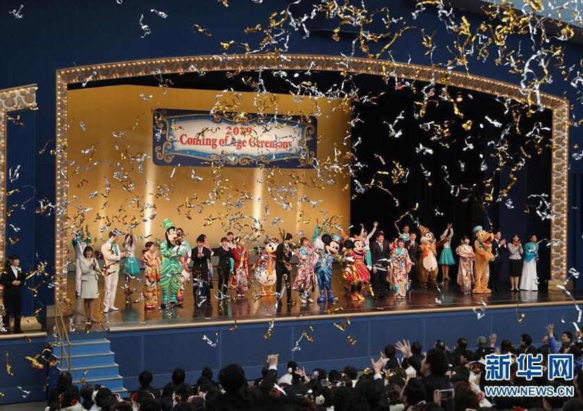 1月14日,在日本千叶县的东京迪士尼乐园,迪士尼卡通人物与参加“成人礼”的年轻人共同庆祝。新华社记者杜潇逸摄