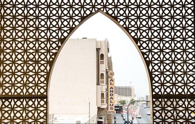 阿拉伯风情的建筑细节很美,在过天桥的时候,我们被一面类似窗棂的屏风吸引住,透过屏风看到的城景很中东。