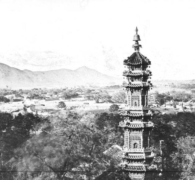 原图注:View of the Summer Palace. Yuan Ming Yuan Pagoda. Before the Burning, Pekin, October 18, 1860。直译为:圆明园远眺。被烧毁前的圆明园宝塔,北京,摄于1860年10月18日。近处为清漪园万寿山花承阁多宝琉璃塔。