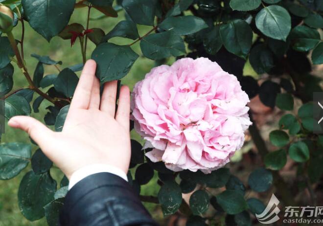 一朵怒放的月季花,个头跟手掌差不多大小。花展共有880个月季品种和近百株树状月季,为游客营造一个缤纷的月季王国。