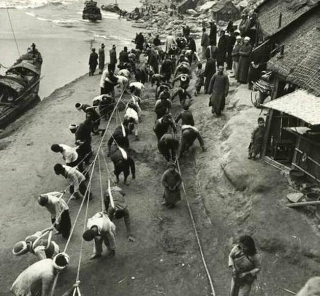 老照片:1946年四川万县长江三峡纤夫和附近百姓生活
