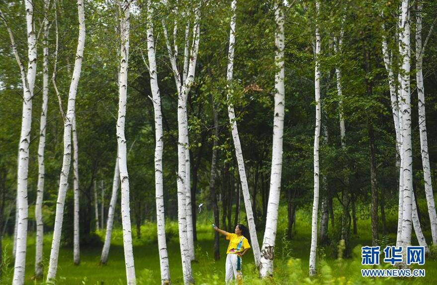 8月8日,游客在伊春市九峰山养心谷景区白桦林里自拍。 时值八月,黑龙江省伊春市林区空气清新,凉爽宜人,吸引众多游客。 新华社记者李晓果摄