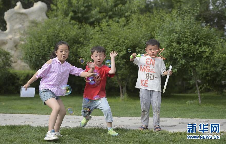 8月7日,孩子们在皋兰山上的兰山公园吹泡泡嬉戏。眼下,甘肃省兰州市皋兰山绿树葱郁,空气清新,吸引众多游客来此休闲游玩。皋兰山曾经是是荒山秃岭,经过多年植树绿化,成为名副其实的“城市绿肺”。 新华社发 (马希平 摄)