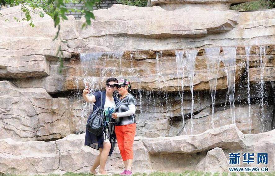 8月7日,两名游客在皋兰山一处生态园内自拍留念。眼下,甘肃省兰州市皋兰山绿树葱郁,空气清新,吸引众多游客来此休闲游玩。皋兰山曾经是是荒山秃岭,经过多年植树绿化,成为名副其实的“城市绿肺”。 新华社发 (崔翰超 摄)