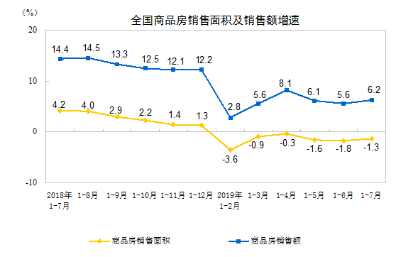 从销售指标看,1—7月份,商品房销售面积88783万平方米,同比下降1.3%,降幅比1—6月份收窄0.5个百分点;商品房销售额83162亿元,同比增长6.2%,增速加快0.6个百分点。在连续两个月增速回落后,销售指标增速有所反弹,不过,从销售面积指标来看,已经连续7个月负增长。