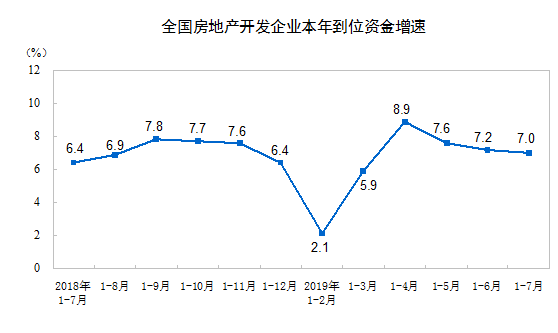 再来看资金指标,1—7月份,房地产开发企业到位资金99800亿元,同比增长7.0%,增速比1—6月份回落0.2个百分点。这是该指标连续第3个月增速回落。