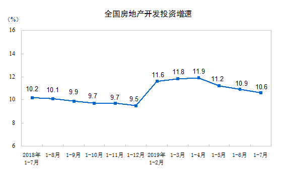 首先从投资指标来看,1—7月份,全国房地产开发投资72843亿元,同比增长10.6%,增速比1—6月份回落0.3个百分点。这是该指标连续第3个月增速回落,并创年内新低。