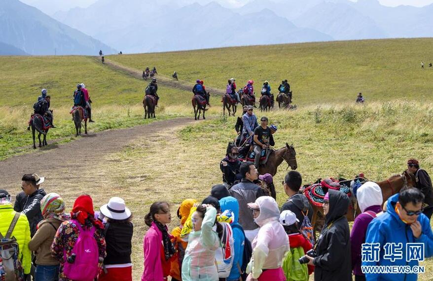 8月14日,游客在喀拉峻草原上体验骑马。 喀拉峻草原位于新疆伊犁河谷的特克斯县境内,山峦连绵起伏,线条柔美,层次分明,犹如一幅大气磅礴的天然画卷。 新华社记者 胡虎虎 摄