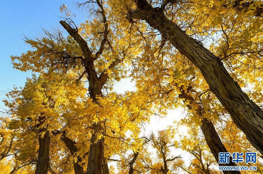 10月16日拍摄的内蒙古阿拉善盟额济纳旗境内的胡杨林。 金秋时节,位于内蒙古阿拉善盟额济纳旗境内的胡杨林披上了金黄色的外衣,在阳光的照射下呈现绚丽夺目的色彩,成为沙漠深处的一抹亮色。 新华社记者 彭源 摄