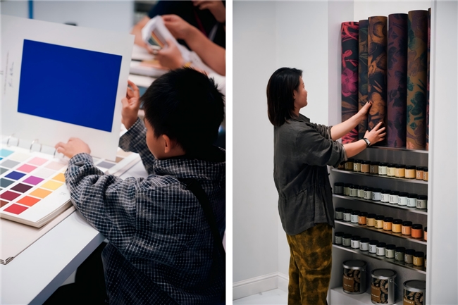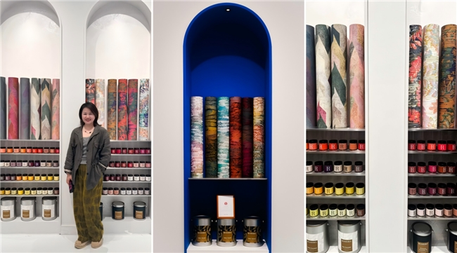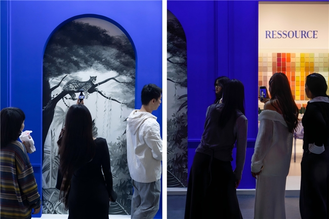 此次展览,芮颂展厅的设计以克莱因蓝为主色调,营造出一种冷静、优雅的法式氛围。深邃的蓝色与精美的Ananbo壁纸相得益彰,共同构建了一个浪漫且艺术感十足的空间。步入展厅,观众仿佛进入了一幅法式画作,感受色彩带来的情感共鸣与视觉享受。