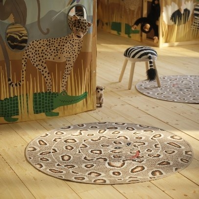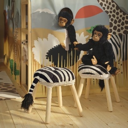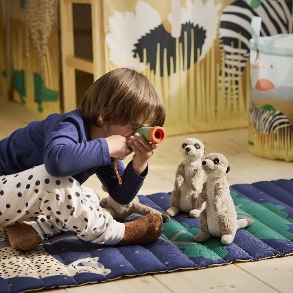 SANDLOPARE 桑罗帕瑞 系列不仅有栩栩如生的毛绒玩具,包括聪明又善于社交的狐獴、快如闪电的猎豹、可爱柔软的河马、高挑优雅的长颈鹿等。此外,该系列还有斑马造型的凳子、蛇形地毯,以及绗缝垫和储物箱,共同打造出一个仿佛置身非洲大草原的儿童卧室露营地。