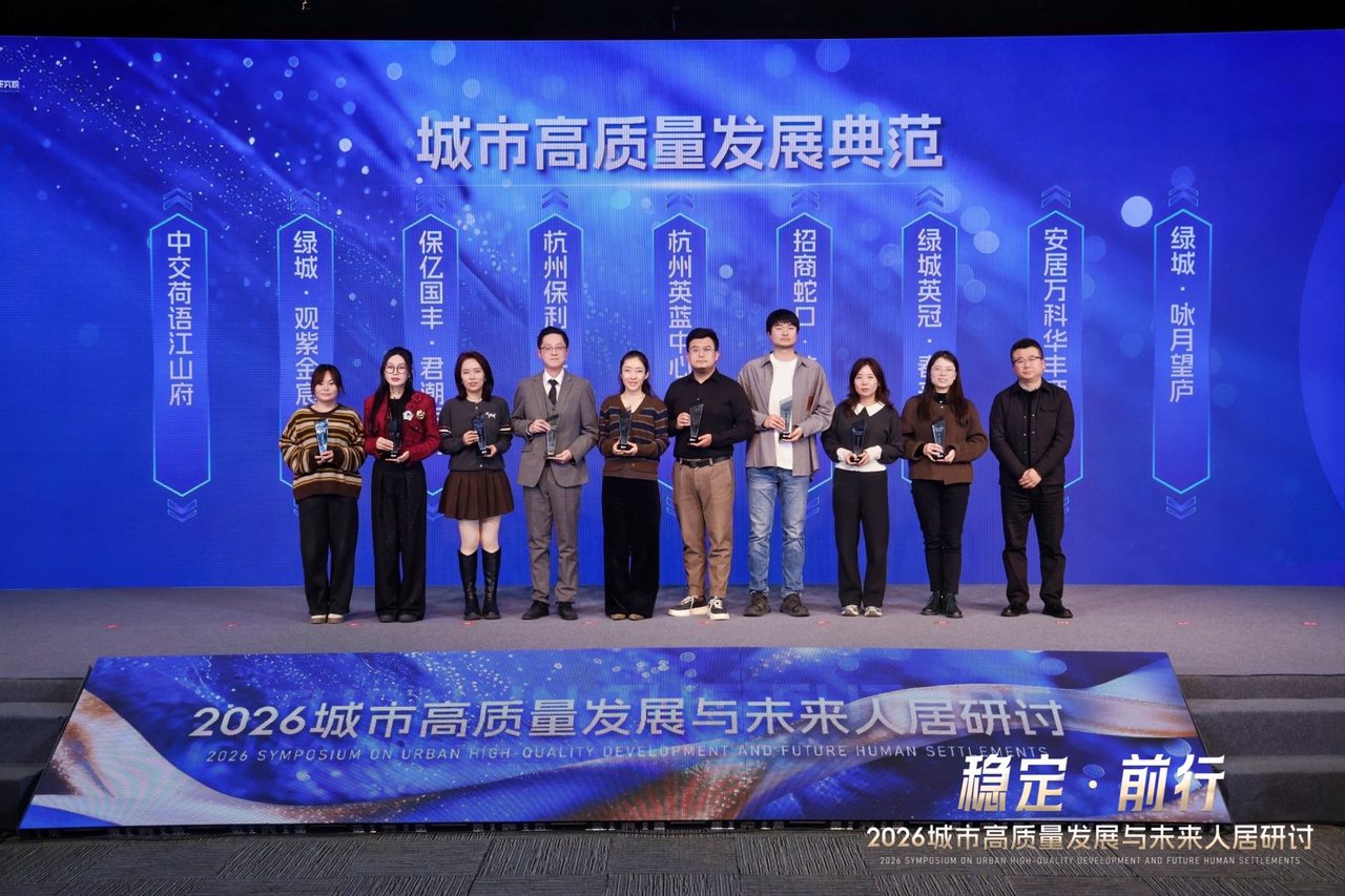 “城市高质量发展典范”:浙江大华房产、建发房产|杭州、绿城中国浙江区域公司、杭州钱塘新区建设投资集团、杭州临平数智城、滨江集团、招商蛇口浙江公司、中交荷语江山府、绿城·观紫金宸庐、保亿国丰·君潮润府、杭州保利·天奕、杭州英蓝中心、招商蛇口·杭序府、绿城英冠·春来晴翠园、安居万科华丰项目、绿城·咏月望庐。