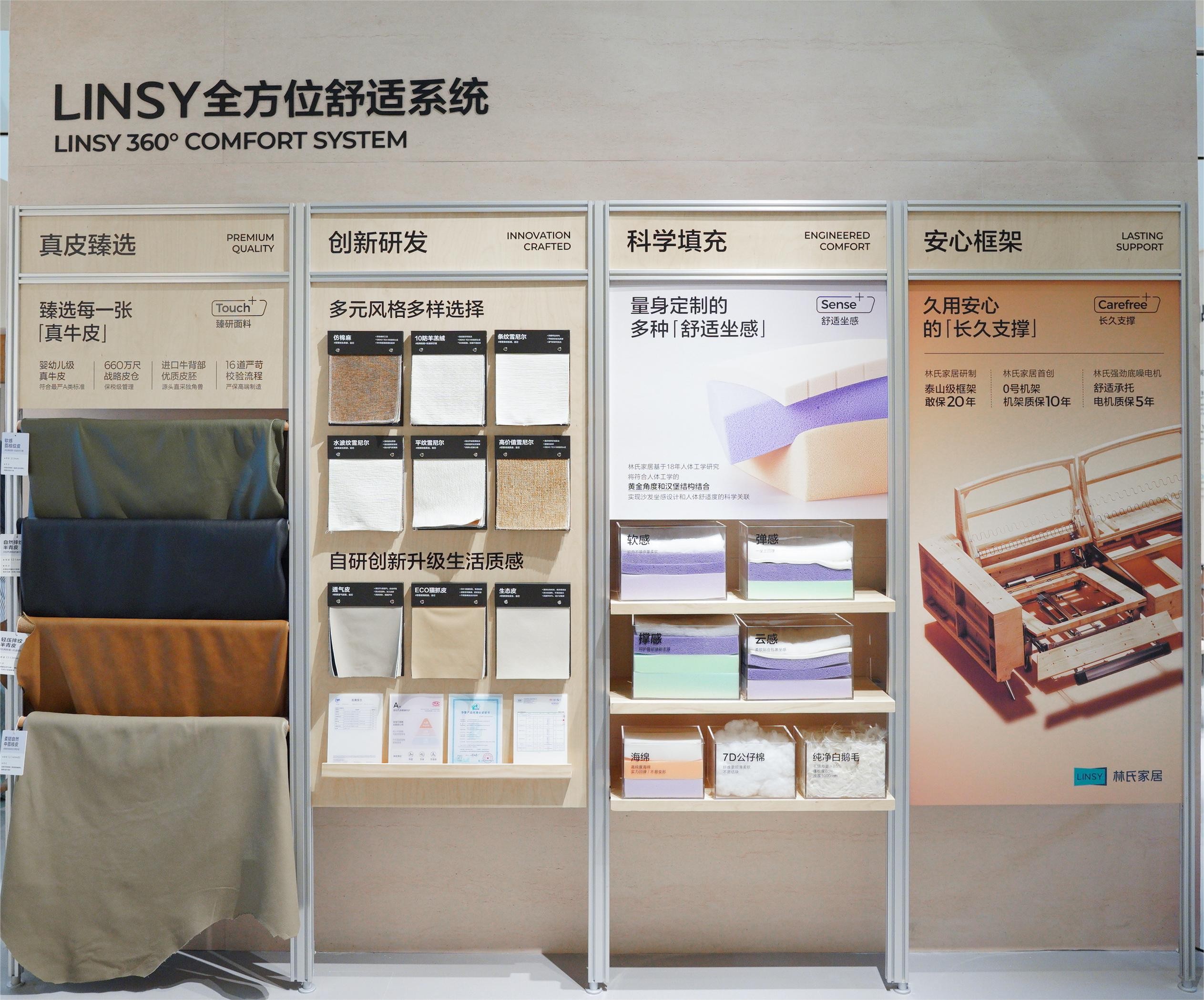 如果说实木馆是林氏家居“向上突破”的战略表达,那么近700㎡多风格软体馆则是其核心优势的集中呈现。馆内汇集现代、意式、包豪斯等多元风格产品,均为品牌自主研发,展现出在全风格、全品类赛道上的完整覆盖能力。此次展出的软体新品在2025年完成了新一轮品质升级,围绕面料、框架、坐感三大维度,品牌建立了更精细化的标准体系。