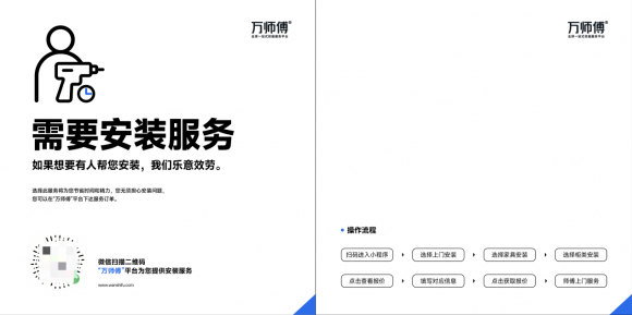 对此,万师傅提出通过“安装服务卡”一站式解决,于商品包装盒中内置“安装服务卡”,直接向消费者提供交付方案,商家无需增加售后成本,顾客也能第一时间找到专业安装师傅,零成本实现“交付有保障,售后有兜底”。